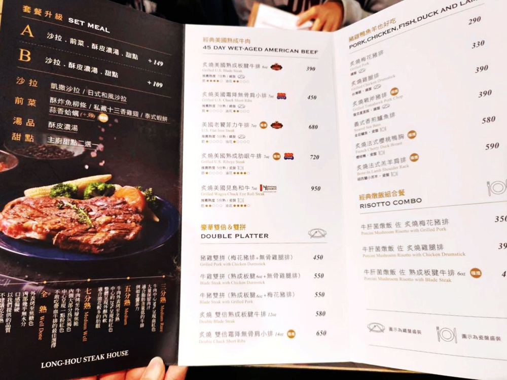 瀧厚炙燒熟成牛排-桃園中壢大全聯店的菜單設計相對直覺,主打不同部位與份量的熟成牛排,價格從入門款到中高價位皆有選擇,也提供豬排、雞排與魚排等非牛排主餐。另有雙人套餐與加價升級方案,適合家庭或聚餐需求,整體消費彈性高。